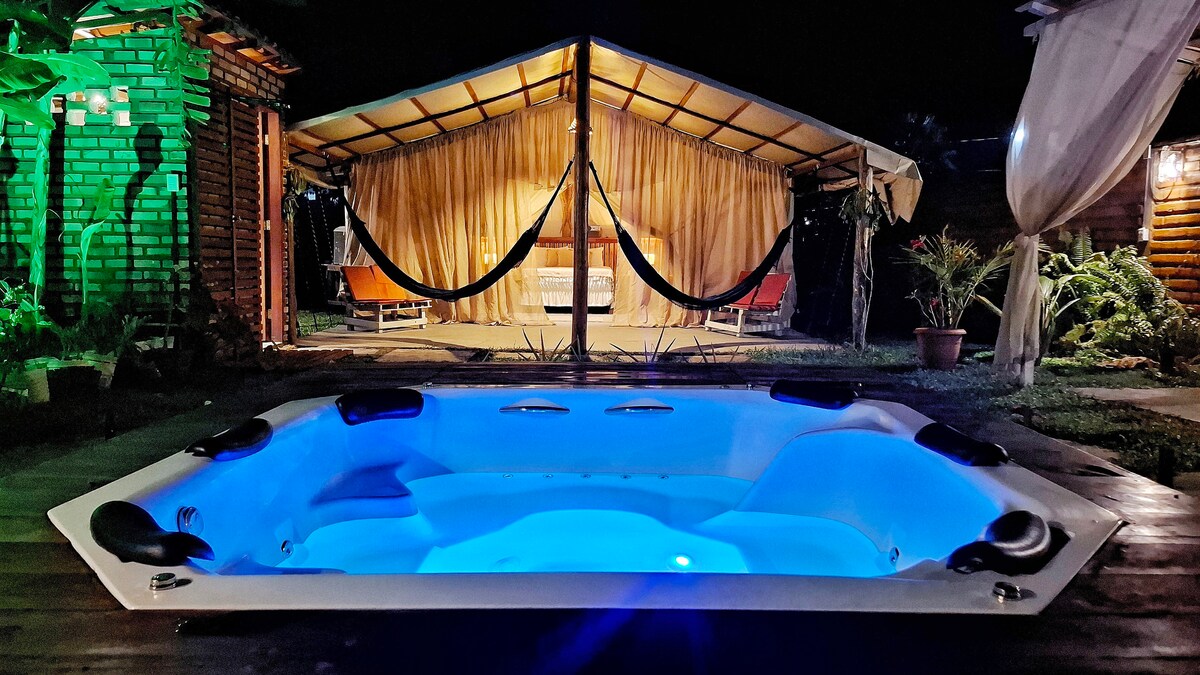 Tenha a experiência de acampar em um belo jardim privado e seguro com o máximo de conforto. Com uma hidromassagem e um projetor de cinema para curtir aquela vibe. Possui Ar condicionado que pode ajudar a refrescar o quarto porem não fica super gelado. Particularmente eu recomendo que aproveitem da segurança do local para dormir com tudo aberto, ventiladores ligados e aproveitar o máximo dessa experiência única. Próximo ao principal comércio do povoado e da praia.