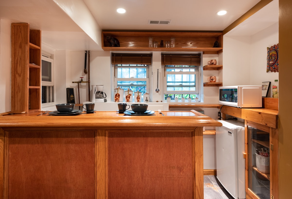 Un bonito apartamento tipo estudio en el sótano de una casa recién reformada. Los huéspedes tienen una entrada privada con su propio baño privado. También puedes utilizar una lavadora y secadora de tamaño completo. Otros servicios incluyen un bar de honor surtido de cerveza y vino, un juego de estilo arcade con más de 200 títulos populares, incluido Ms. Pac Man, y café/té. Ten en cuenta que vivimos arriba, pero el espacio es privado. Está separado por una escalera y una puerta con cerradura. Es comparable a una habitación de hotel, pero más agradable.