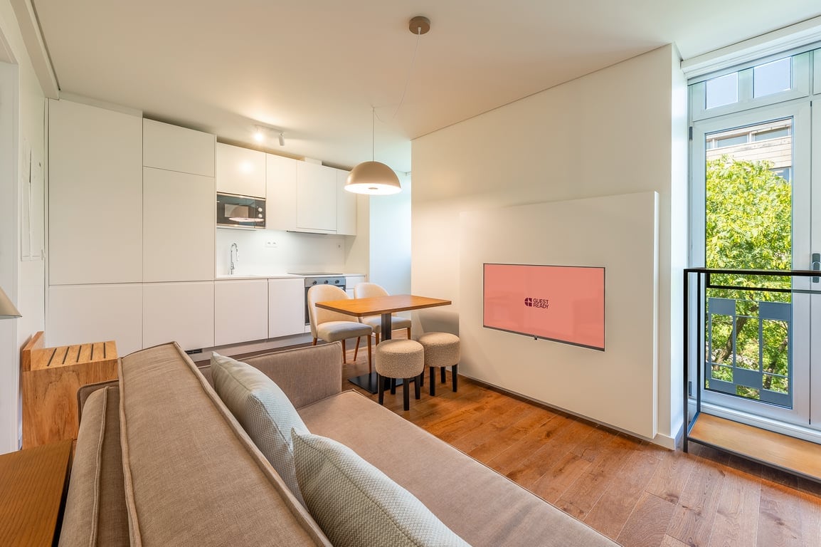 Con unos 45 m2, tienes todo lo que necesitas para que te quedes bien. El apartamento está equipado con una cama doble tamaño queen, baño con caja con ducha, escritorio para trabajar, TV inteligente, internet y cocina totalmente equipada para cocinar. Un espacio de trabajo compartido, gimnasio y lavandería se encuentran en el piso -1. Tenemos garaje disponible por 15 €/ día. Todas las departamentos son muy similares en tamaño y lo que cambia es el diseño. Tenemos limpieza cada 2 días de lunes a viernes.