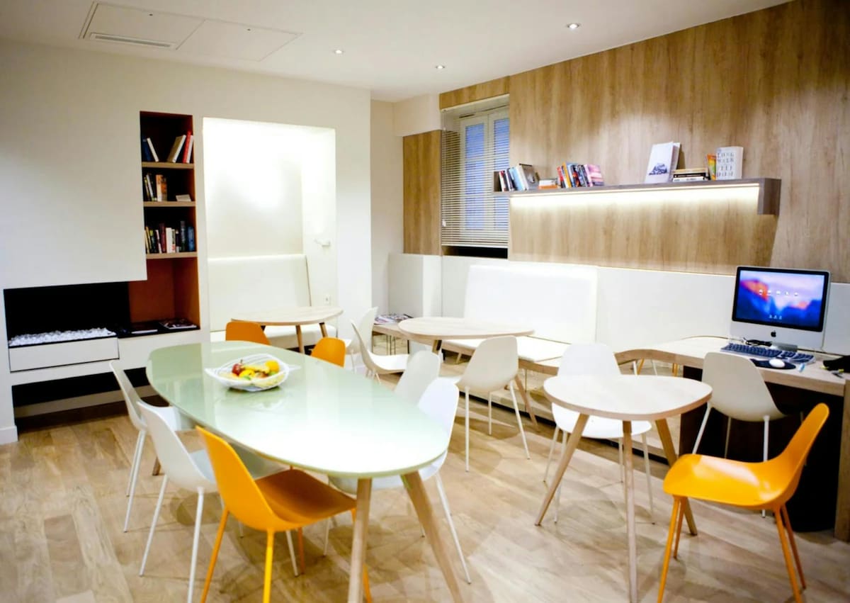 The classic room at Hotel La Manufacture is a cozy retreat with pastel tones, perfect for relaxation. It features a smart flat screen TV, universal charger, air conditioning, secure safe, unlimited free Wi-Fi, and an electric kettle. Please note, this room category is not accessible for guests with reduced mobility, but deluxe rooms are available with accessibility features.