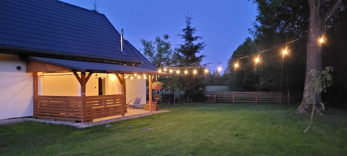 Este lugar único tiene su propio estilo. Está cerca de la naturaleza, puedes relajarte tumbado en una hamaca o caminar activamente por los bosques y prados de los alrededores. Por la noche, el ambiente se crea con una hoguera segura o una cena en la terraza. Ver el cielo estrellado gratis. La casa tiene un salón con cocina, 2 dormitorios, un altillo y un baño. Todas las habitaciones están totalmente equipadas. La terraza de 36 m2 es un espacio adicional para pasar el tiempo.