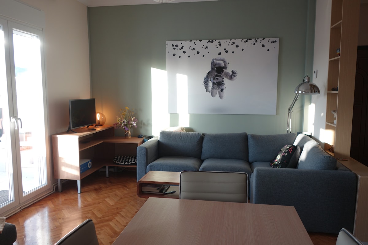 Stylishly designed on the 5th floor apartment within a quiet residential neighbourhood just 2 mins walk from the sea! A great base from which to explore Thessaloniki and very convenient for the walks in the beautiful coastline of Thessaloniki. Fully Furnished with Double bed, Desk, Wardrobe, smart TV with Netflix, Wi-Fi, Kitchen, Bathroom, Seating Area and more!