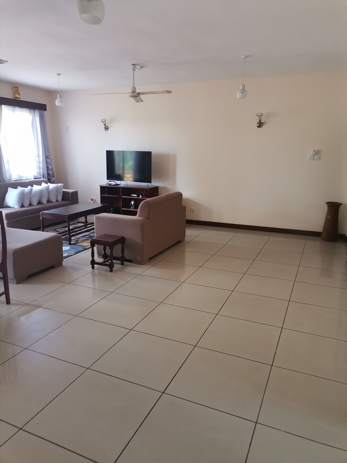 Acogedor apartamento estudio con servicios (Bamburi) amueblado. * Adecuado para 2 adultos y 1 niño o 3 adultos, amueblado con una cama tamaño queen y una cama individual. * Incluye aseo diario. * Mesa de comedor con cuatro sillas, sofá, mesa de centro. * Aire acondicionado *TV * Caja fuerte con llave * Balcón con dos sillas y mesa de centro * Cocina: nevera, microondas, hervidor de agua, cafetera, tostadora, vajilla y cubiertos. * Acceso a servicios: piscina, zona de juegos para niños, bar de playa, restaurante, gimnasio, playa, lavandería. * A 21 km del aeropuerto internacional de Moi. * A 26 km de SGR Mombasa.