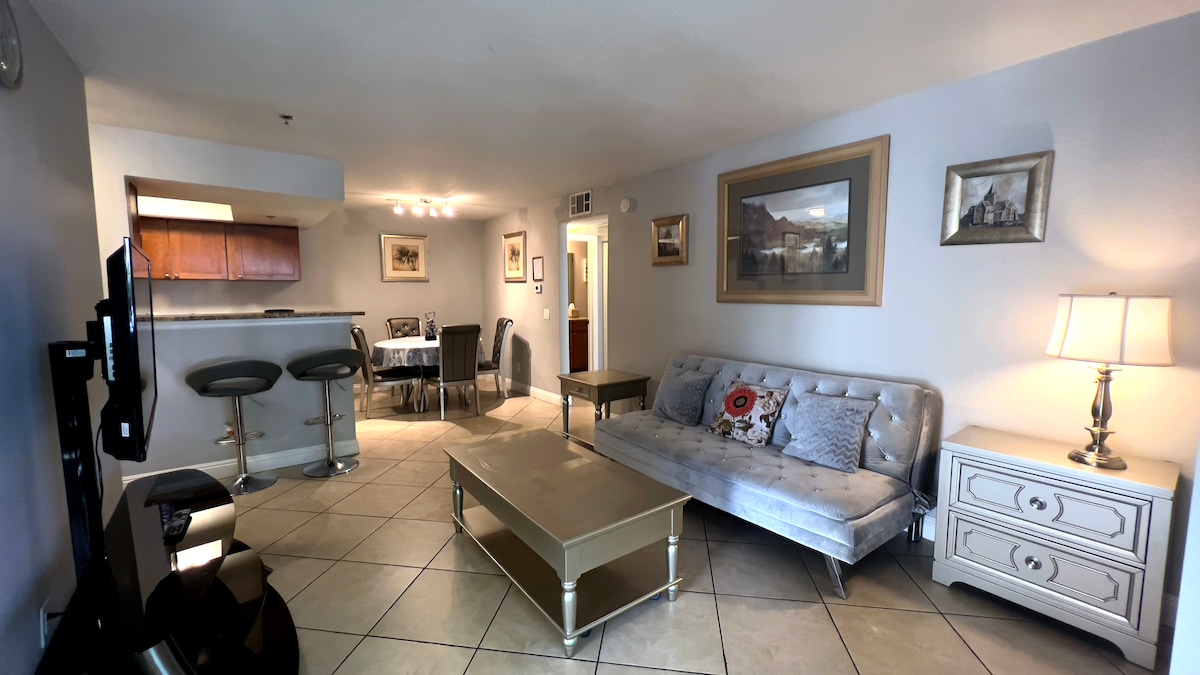 Remodeled 1BR condo less than a mile from the Las Vegas Strip in a secure, guard-gated community. Enjoy pools, hot tubs, gym, FREE PARKING AND NO RESORT FEES. Fully remodeled interior, full kitchen, Keurig coffee maker and coffee. Fast Wi-Fi, Smart TV with Netflix and YouTubeTV for local channels and sports , and comfortable living space. Perfect for leisure, concerts, business travel, and extended stays.