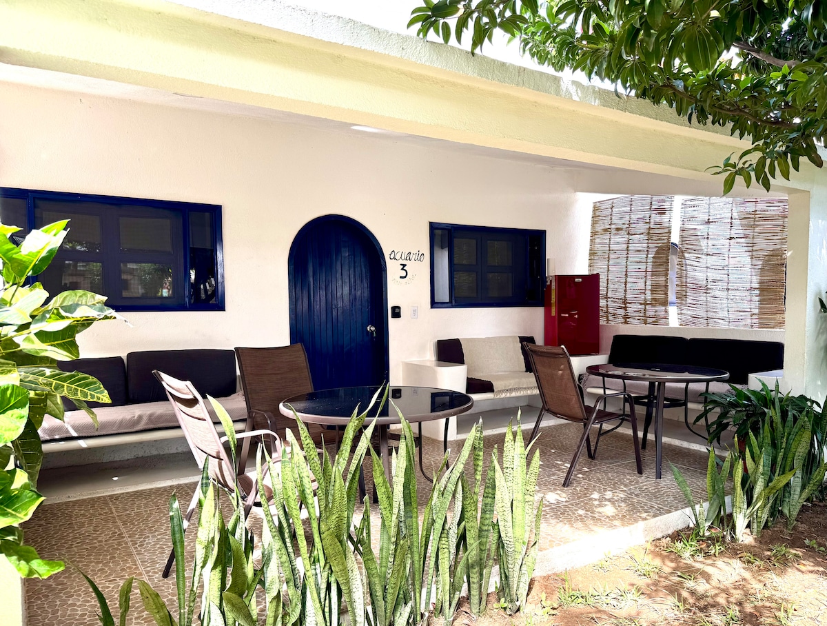 Amplio, nuevo y muy comodo con baño privado y ducha abierta con total privacidad. cuenta con aire acondicionado, alberca, con una excelente vista en el roof del edificio, refrigerador, parrilla, wifi, smart tv, a 5 min caminando de la playa del amor frente a campo deportivo. gay friendly, pet friendly y ecofriendly. ideal para tener vacaciones con la mayor comodidad. "Descuento activado por posible ruido (por obras de terreno cercano)solamente durante el día"