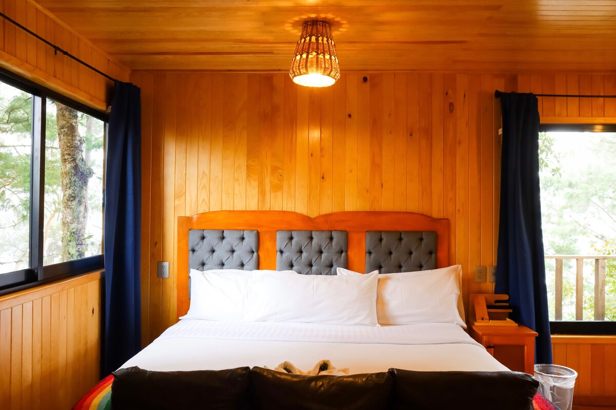 Cabaña #3 (Dos Plantas) Disfruta de una experiencia arquitectónica única en el corazón de San José del Pacífico. Nuestra Cabaña #3 está diseñada para que te sientas parte del bosque, con accesos integrados a la naturaleza y vistas inigualables. Lo que hace especial a esta cabaña: El Acceso: La aventura comienza antes de entrar. Para llegar a la primera planta, caminarás sobre un puente suspendido entre árboles, y para la segunda, subirás una escalera integrada en el interior.