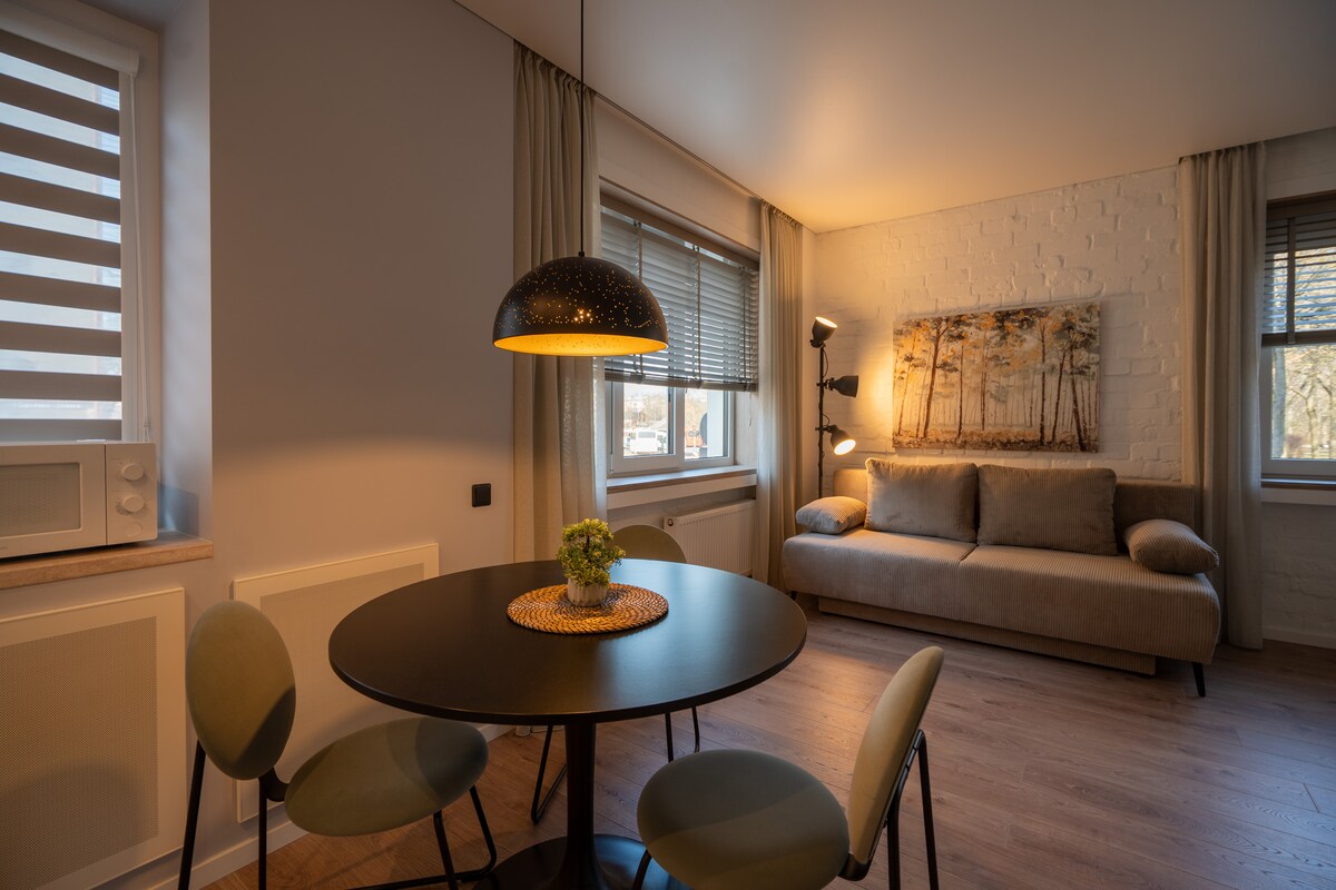Este elegante lugar , justo después de la renovación completa, está perfectamente diseñado para satisfacer todas tus necesidades . Cocina totalmente equipada con lavavajillas , horno y microondas, agua potable filtrada, hervidor de agua y mucho más . Una lavadora, secadora y plancha también están a tus necesidades. El dormitorio principal tiene cama tamaño king, un gran armario en la esquina y acceso al balcón. La sala de estar tiene un gran sofá cama de esquina, perfecto para una pareja . Muy cerca de tiendas y transporte público, a 7 minutos en coche del centro.