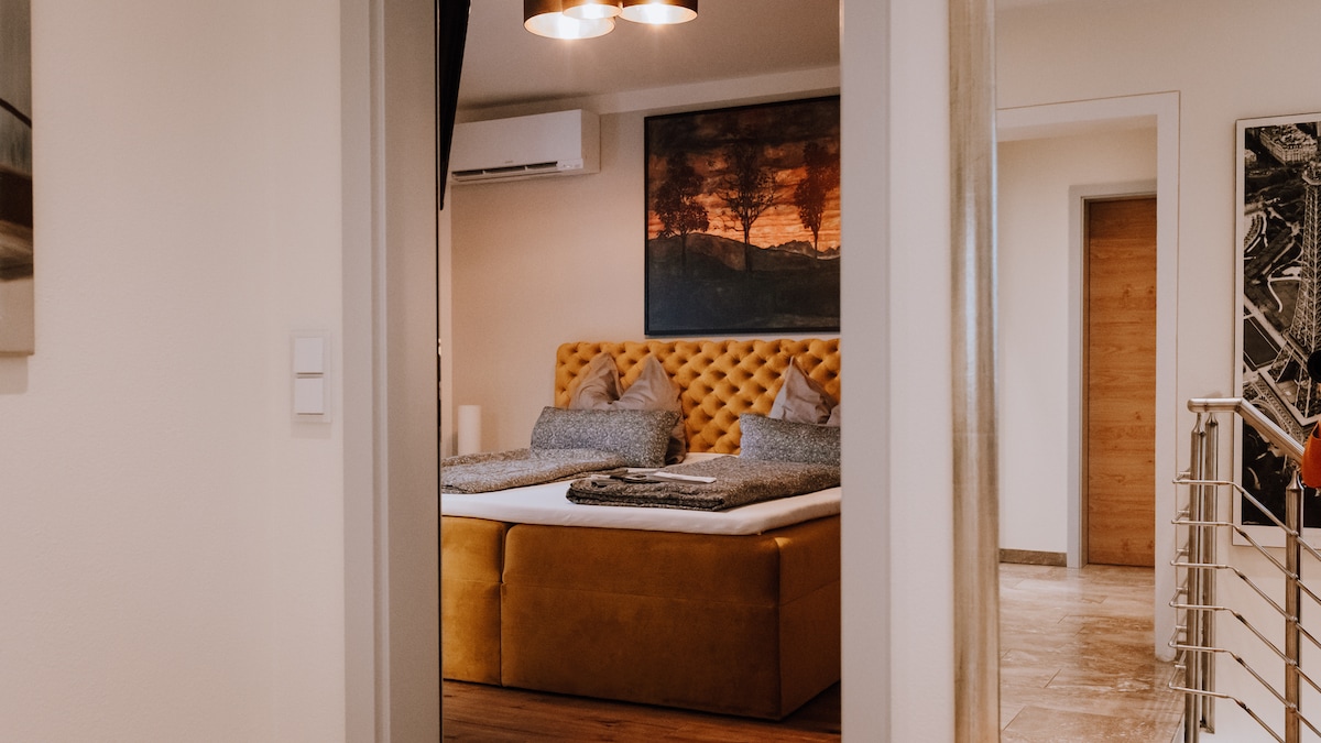 El Atelier Galerie Blau de aprox. 28 m² se ha convertido en un acogedor apartamento de estilo dúplex con entrada independiente y una pequeña terraza ajardinada. En la zona superior se encuentra el nivel de descanso y trabajo con una cama doble de 180 x 200 m. En la planta baja se encuentra el comedor con una cocina americana y un sofá, que se puede plegar en un sofá cama si es necesario. Justo al lado está el pequeño baño con ducha. También hay lavadora a tu disposición.