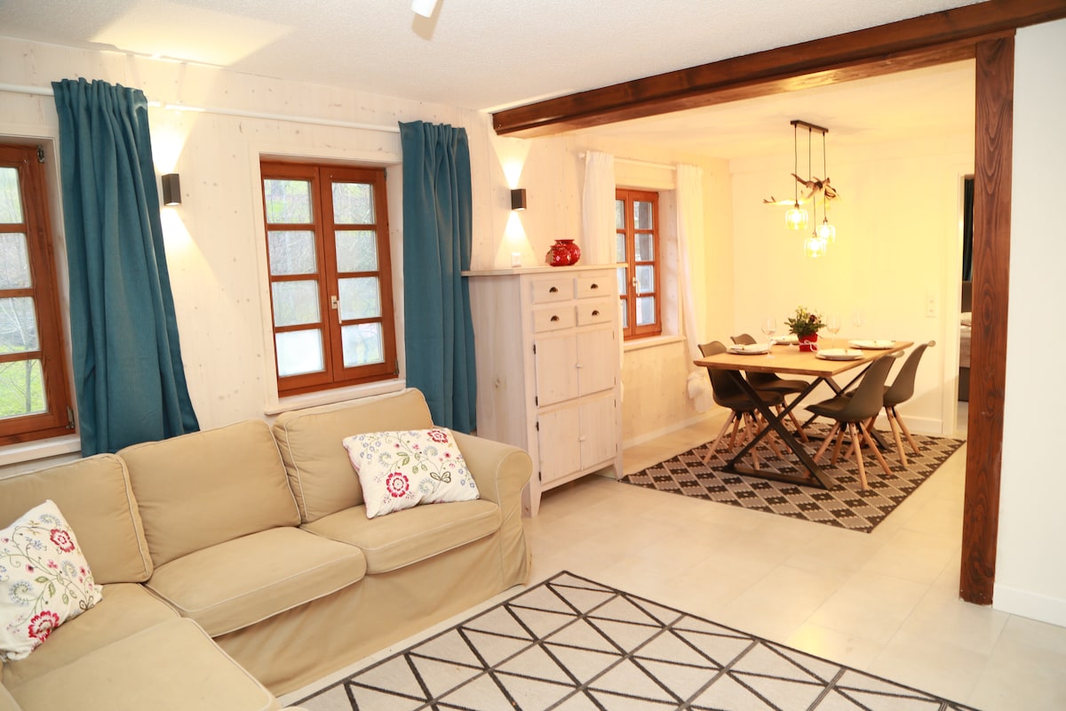 El apartamento, amueblado con cariño, es adecuado para parejas que buscan tranquilidad y para familias que quieren disfrutar de unas vacaciones en la naturaleza. El departamento está ubicado en medio de bosques y prados, tiene conexiones directas con rutas de senderismo y está a solo 5 minutos en coche de las tiendas en el centro de la ciudad. Está ubicado en la planta baja de una antigua granja y está totalmente equipado. Nota: En el sitio, se debe pagar una tasa turística de 2,05 € por persona (12 años en adelante) por noche.