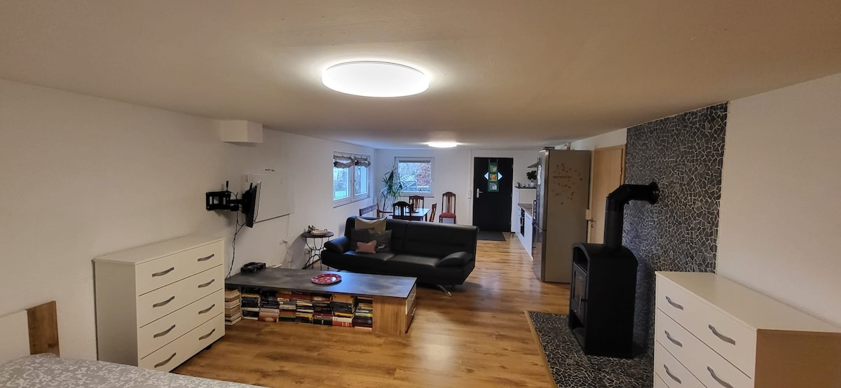 Eine besondere Unterkunft im Loftcharakter. Ein mit viel Liebe zum Detail gestaltetes Loft mit Doppelbett&Schlafcouch für 3 -4 Personen. Ein großzügiges Badezimmer mit Badewanne/Dusche. Offener Raum mit Küche zur Selbstversorgung. Privater Außenbereich mit Tisch und Gartencouch. Trotz geteilten Grundstück mit einem historischen Haus komplette Unabhängigkeit und Privatsphäre. Für Naturliebhaber ein perfekter Rückzugsort am Waldrand. 8 min zum Baldeneysee. ÖV (5 min zum Bus/14 min S-Bahn)