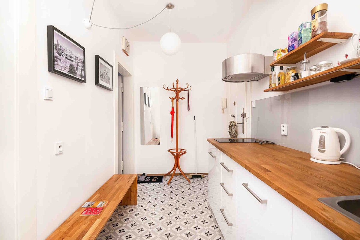 Alójate en Praga rodeado de lujo, arte y diseño. Un lugar elegante y tranquilo con todas las comodidades necesarias te abrazará cálidamente y permitirá una vida cómoda en la parte residencial más atractiva de la ciudad. Estamos deseando recibirte para tu estancia de media o larga duración. La suite está bien equipada y te da la bienvenida con una gran cocina y comedor, TV moderna con Apple TV, O2 TV y servicios de Netflix, dormitorio muy privado y acogedor (colchones de lujo, edredones de primera calidad) y material para hacer ejercicio como esterilla de yoga, mancuernas o cuerda para saltar.