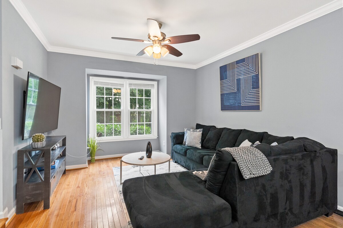 Wake up to the charming sound of birds from the wooded park just behind this cozy retreat. Enjoy the electric recliner and 65” smart TV by the fireplace. Custom-built open kitchen (no oven), comfortable queen bedroom, private full bath, laundry, and fenced backyard for relaxing privacy. Perfect for couples or business travelers—minutes to Kingstowne, Ft. Belvoir, National Harbor, Old Town Alexandria & Washington DC, with easy metro access and two assigned parking spaces.