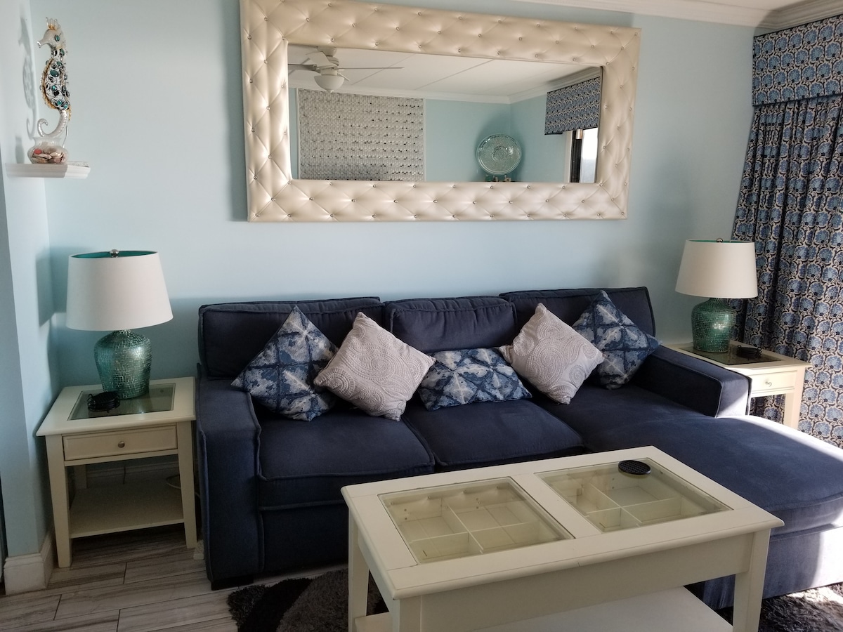 ¡Apartamento recientemente renovado! - Vista al agua. Observa el tráfico de barcos. - Balcón extragrande con cómodos asientos. - Cómoda LoveSac sofá. - Camina hasta el paseo marítimo o la playa - 15 minutos. - Camina hasta el parque de atracciones Jolly Roger. - Apaga el muelle de la comunidad debajo de la unidad. -Cerca de restaurantes y compras. - Cocina pequeña para cocinar. - Wifi rápido y televisores en streaming. - Casa totalmente equipada. ¡Ropa de cama limpia, toallas, papel higiénico, toallas de papel y mucho más!