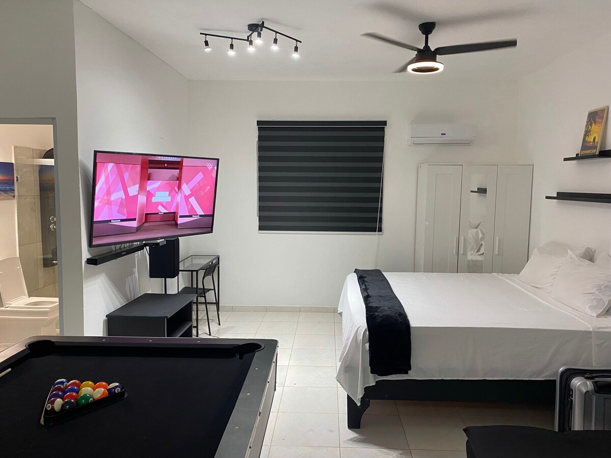 Immerse yourself into our newly renovated large studio apt nestled in the heart of Sosua. It is just 2 mins walking to a private beach. This apartment benefits from being in a safe and private location. On-site, you will have a personal property manager to assist you with all your needs, a laundry, a cafe.