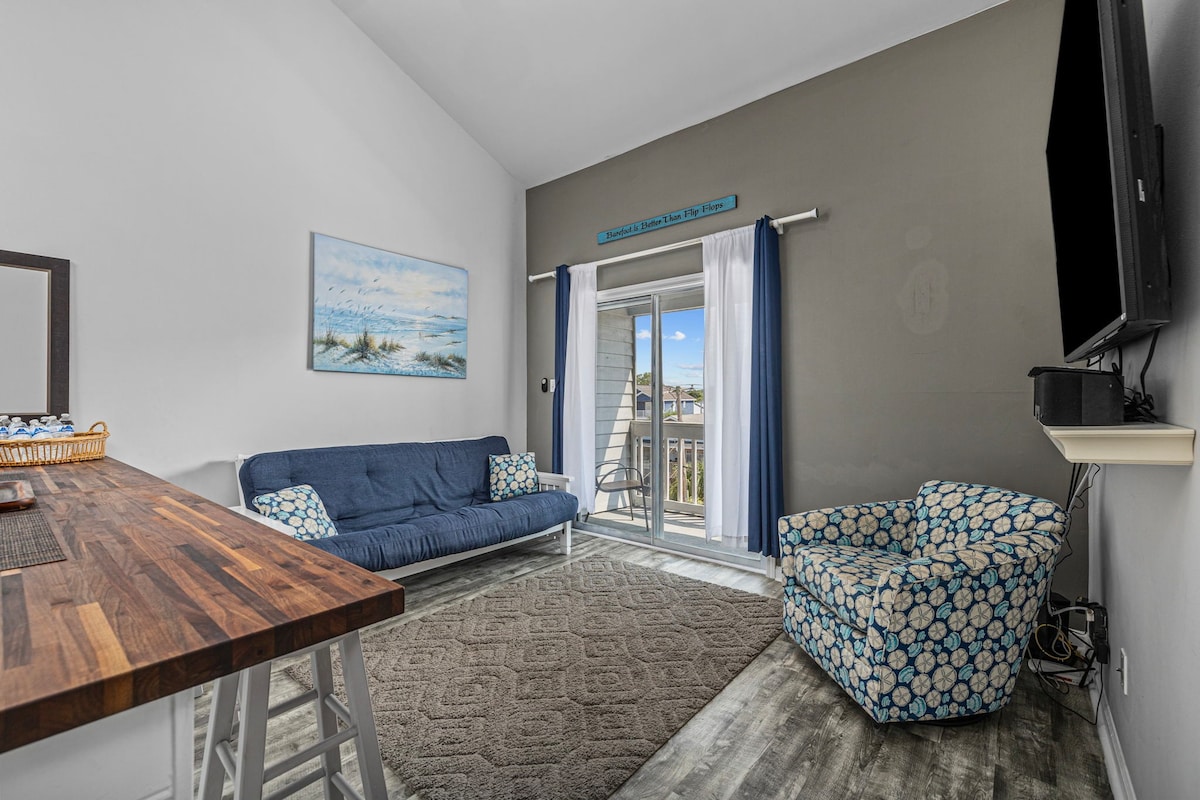 ¡Este bonito y acogedor apartamento está a solo 2 minutos a pie de la playa! El edificio de poca altura permite más tranquilidad y privacidad, ¡a solo 15 minutos del corazón de Myrtle Beach! Este apartamento del segundo piso incluye una cocina completa, un dormitorio y un baño. Sin ascensor, las escaleras conducen cómodamente hasta la puerta. El balcón ofrece vistas al mar y al acceso a la playa cercana. Zona residencial a poca distancia a pie de la playa y varios restaurantes. ¡Ven a alojarte, no querrás irte!