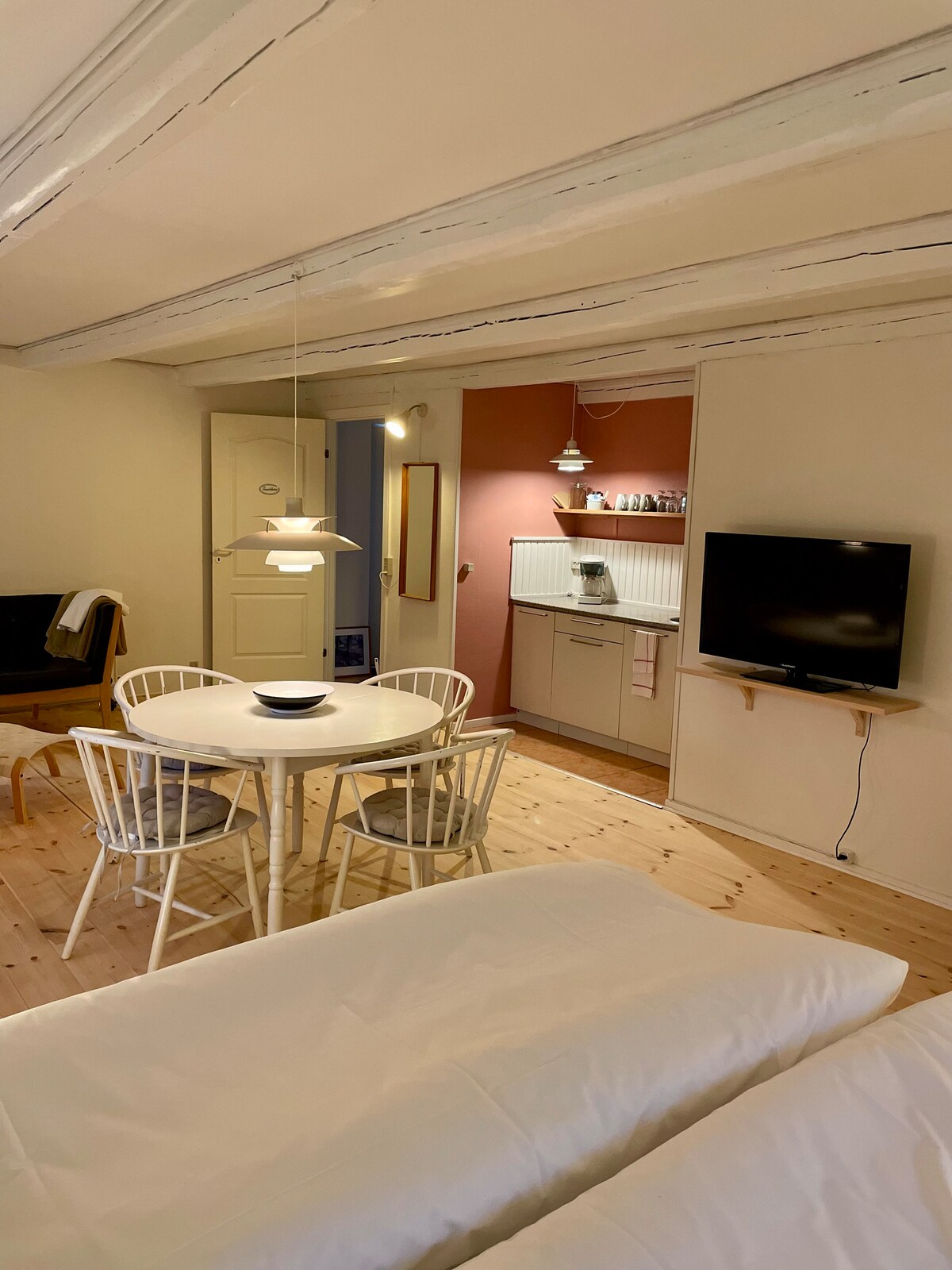 Departamento para 6 personas + niños. Entrada privada y baño. Cama doble de 140 x 200 cm + cama junior (140 cm) Habitación adicional en la 2ª planta: cama doble (180x200cm) + 2 camas individuales (70x200). (Disponible si > 2 adultos). Hay una pequeña cocina nueva con horno, 2 fuegos, lavavajillas, nevera y cafetera (cápsulas gratis). Hay acceso gratuito al jardín, parrilla de gas, cocina sencilla al aire libre y los lagos. La licencia de pesca se puede comprar en línea por 50 kr. Situado en un entorno pintoresco entre 2 lagos, cerca de Odense.