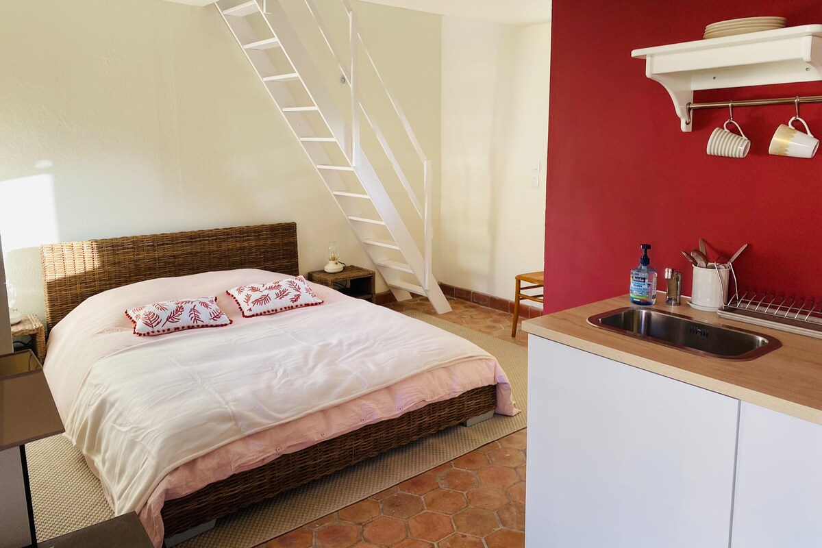 Estudio pegado a la casa familiar , escalera independiente para llegar. CUIDADO CON LA COCINA JUSTO Microondas, Nevera y cafetera Dolce Gusto a su disposición posibilidad de cuna paraguas y juguetes pequeño estudio de cocooning ideal para una pareja con o sin niños . Wifi gratuito POSIBILIDAD DE ESTACIONAR VEHÍCULOS CON TOTAL SEGURIDAD