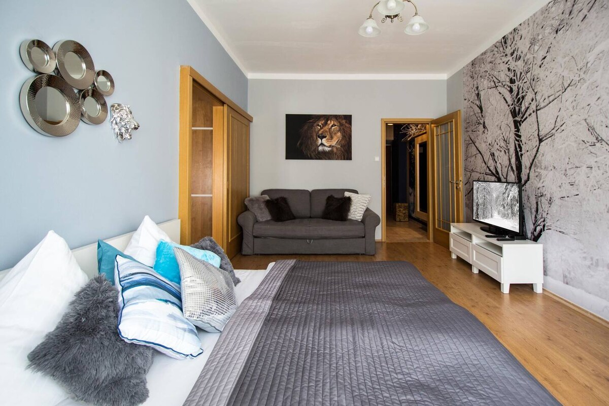 Finalista del concurso TOP Modern-Classic Design 2023. Alójate en el apartamento más elegante que hayas visto nunca. Nota: NO es un apartamento para FIESTAS. La mejor ubicación: - A 2 minutos del Museo Nacional y la plaza Wenceslao. - A 3 minutos de la estación principal de trenes. - A 1 minuto del parque Riegrovy sady, el más bonito. El equipamiento - Ver películas en calidad de cine en casa: pantalla gigante. - Relájate en la sauna infrarroja. El diseño - Elementos y muebles cuidadosamente seleccionados que subrayan el estilo histórico.