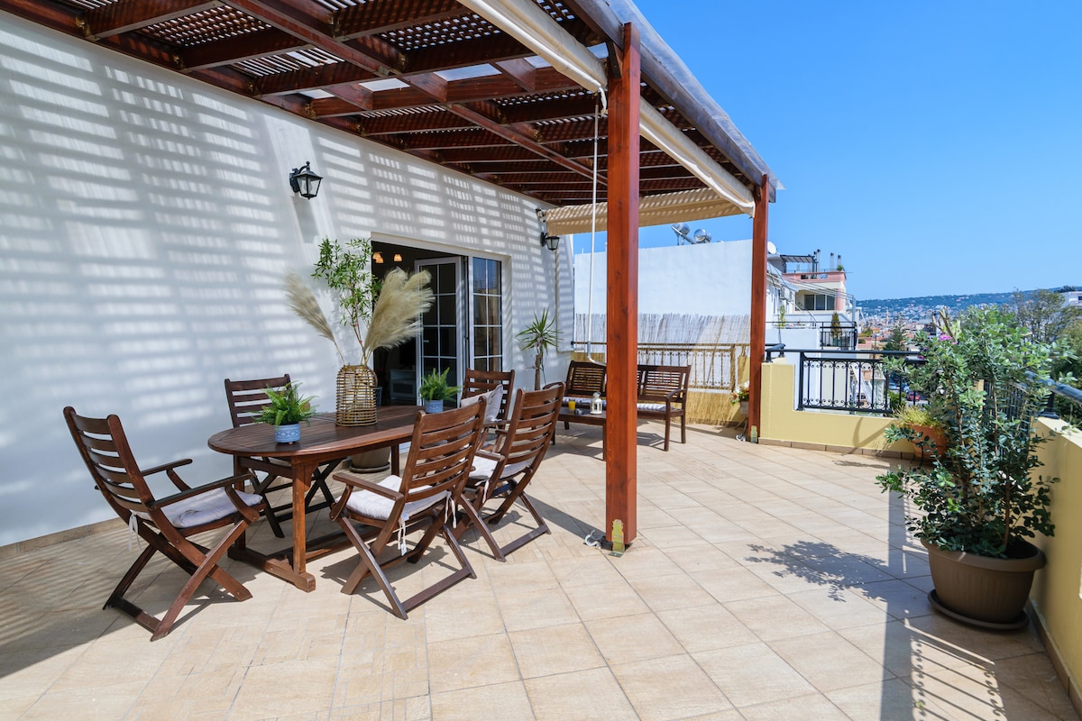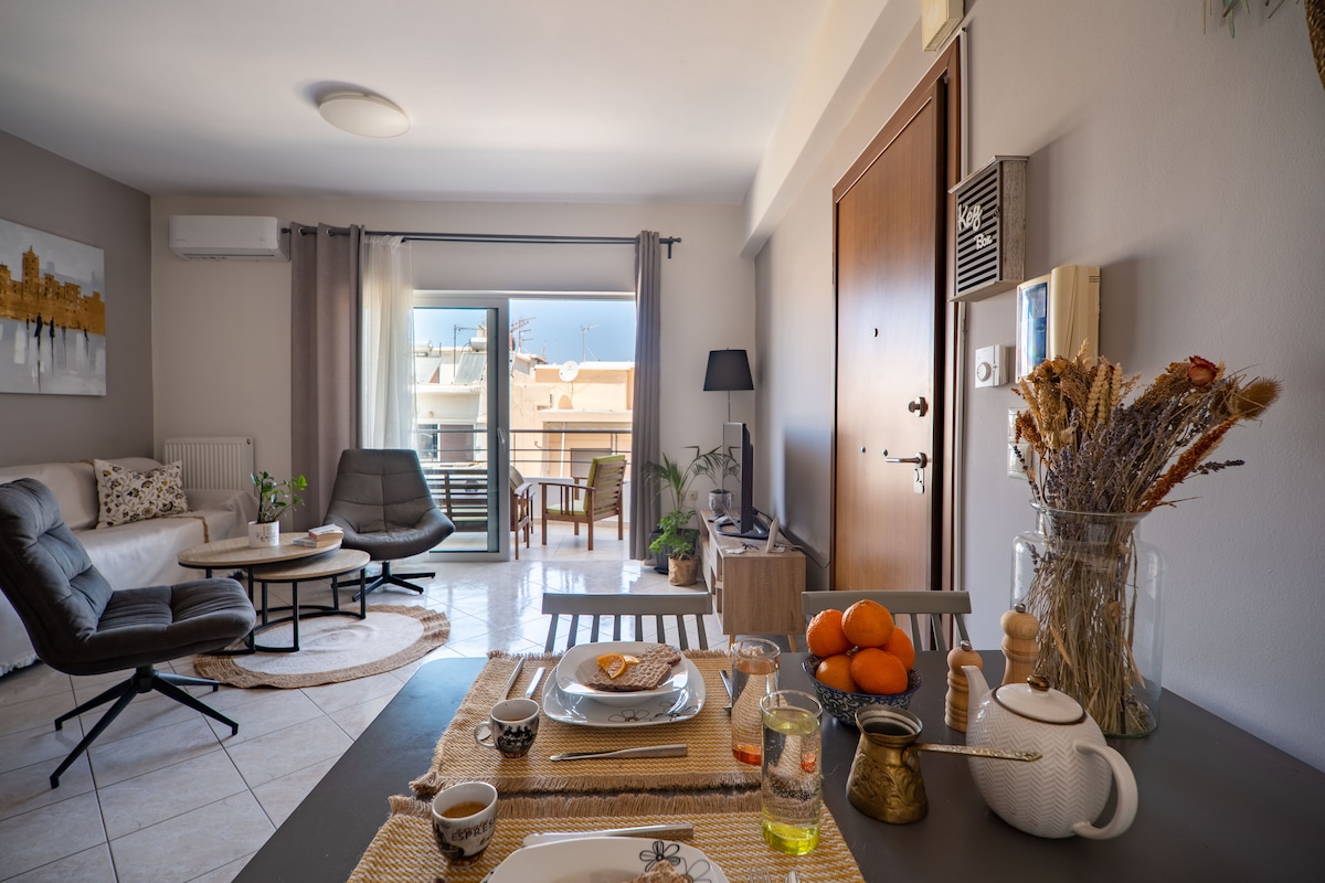 Apartamento moderno y fresco, ¡A 5 minutos a pie del centro de La Canea! Con vistas al mar, al bastión de San Salvador, a las murallas venecianas y al carril bici. En pocos minutos a pie, el visitante puede llegar al Puerto Viejo, al Mercado Central, a la playa de Nea Chora, así como a la estación central de autobuses (KTEL). Espacio ideal para familias con niños, de fácil acceso y equipado con todos los electrodomésticos básicos.