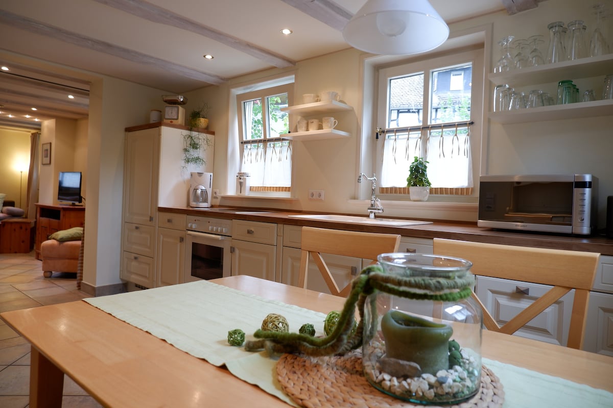 Nuestra casa se encuentra en un histórico pueblo de entramado de madera en el corazón de Hochsauerland, que está rodeado por las hermosas montañas de Sauerland. Puede empezar a caminar directamente y llegar en pocos minutos a la ruta de senderismo de larga distancia certificada Rothaarsteig. Disfrute del tiempo en el acogedor apartamento de 100 metros cuadrados, admire el panorama desde el gran balcón con fantásticas vistas de las Bruchhauser Steine. Las estaciones de esquí se encuentran en los pueblos vecinos: Willingen o Winterberg.