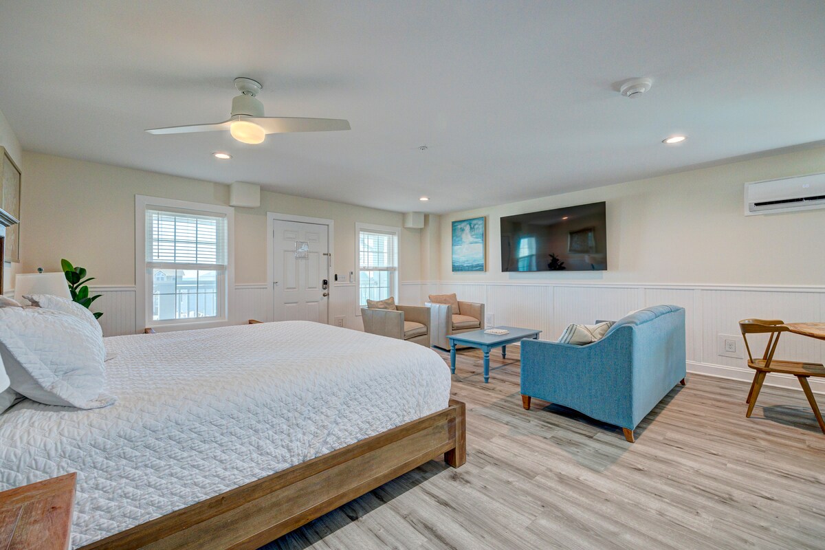 Presentamos el hotel más nuevo de Topsail Island construido en 2022, donde el lujo se encuentra con la comodidad y las impresionantes vistas del océano te esperan. Esta espaciosa suite con cama tamaño king tiene una cocina moderna con electrodomésticos de granito y acero inoxidable, un comedor, una sala de estar con sofá cama, sillas de club y un televisor inteligente de 75 pulgadas, y una W/D. Esta suite privada de hotel híbrido del tercer piso con cautivadoras vistas al mar y 700 pies cuadrados de moderno espacio abierto bien diseñado es el lugar perfecto para relajarse y vacacionar.