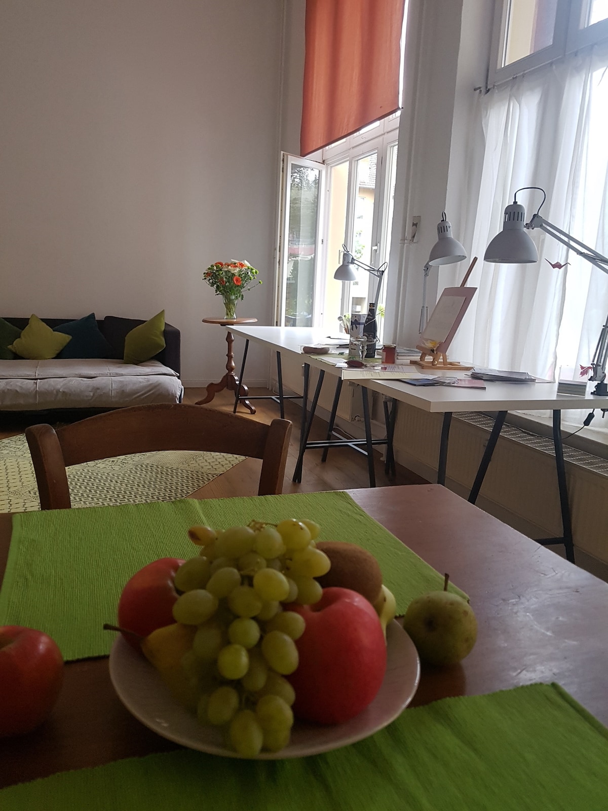 Todo el estudio independiente, 52 m², con cocina integrada bien equipada, pasillo y baño. La ubicación es ideal si desea explorar Eisenach, el Wartburg o las posibilidades de senderismo a pie. (Museo Bachhaus, mercado y Lutherhaus a 10-15 min., Wartburg: aprox. 35 min. (sendero forestal), estación de tren: aprox. 15 min. Senderismo: El bosque comienza justo detrás de la casa y hay muchas posibilidades de senderismo en las inmediaciones. Me encanta dar consejos y material informativo. Las ventanas del estudio dan al patio, que está parcialmente ajardinado y en gran parte se utiliza como aparcamiento. Varios restaurantes y cafeterías se encuentran en el camino al cercano centro de la ciudad (a unos 6-10 minutos a pie). El barrio sur circundante es la zona residencial preferida de Eisenach y merece la pena verlo solo por sus muchas villas Art Nouveau. En invierno, el histórico mercado de Navidad en el castillo de Wartburg es una experiencia especial (todos los fines de semana de Adviento). Si el cercano estanque Prinzenteich (2 min) está congelado, ¡grandes y pequeños lo visitan para patinar! El estudio (para no fumadores), que consta de una gran habitación con cocina integrada, ofrece espacio para 2 personas (1,40 m x 2,00 m) en un cómodo sofá cama. Como siempre hay consultas, ahora existe la posibilidad de un tercer plaza para dormir en un colchón de invitados. El café y los diferentes tipos de té están disponibles de forma gratuita. Se proporcionan sábanas, toallas y secador de pelo. Además, por supuesto: utensilios de cocina/paño de cocina, papel higiénico, jabón, champú/gel de ducha. Los huéspedes que lleguen en coche tienen a su disposición un aparcamiento privado justo delante de la entrada. Aviso: en realidad, el estudio no está disponible los miércoles (a veces es posible llegar el miércoles por la noche). Excepción: vacaciones escolares. Nota: con la excepción de las vacaciones escolares y los días festivos de Turingia, el estudio no estará disponible los miércoles de 16:00 a 18:00. Si vuestra estancia incluye un miércoles, recibiréis un delicioso desayuno como pequeña compensación. Solo tienes que decirme el día que quieres antes de la llegada.