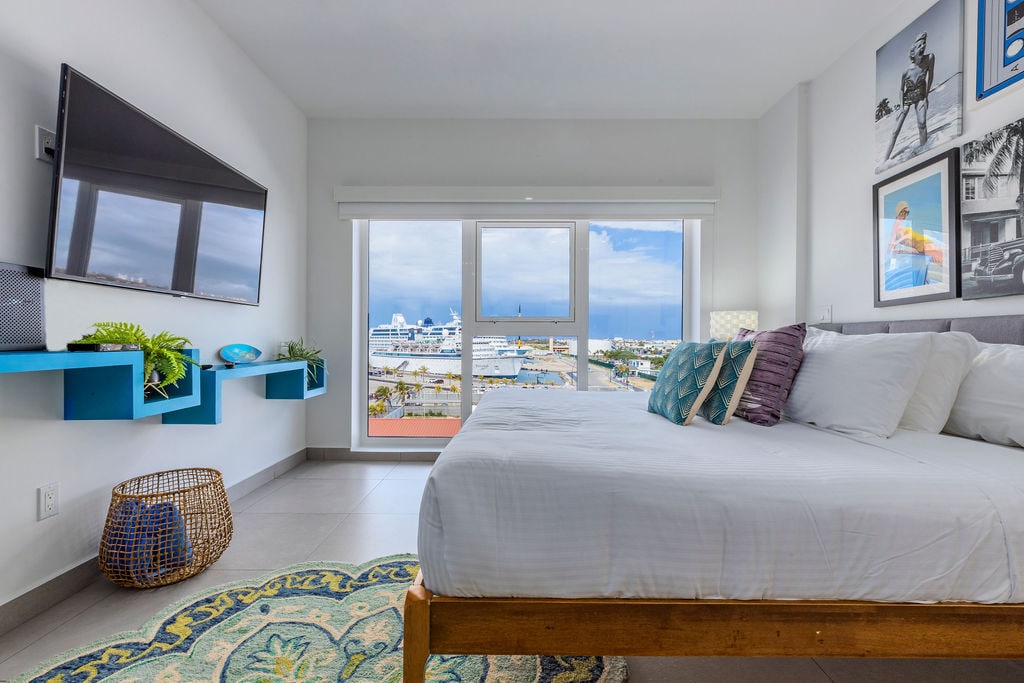 This beautiful studio reflects Aruba's blue colours with a very Modern and CLEAN design, offering a very comfortable KING size bed & King size pillows, a fully functional kitchen, beautiful walk-in closet, modern bathroom with a spa like Rainfall shower. Located on the highest floor of the building with a stunning view of downtown Aruba as well as the harbour! Enjoy the infinity pool and rooftop hot tubs with 360 view and state of the art gym overlooking the water and cruise ships!