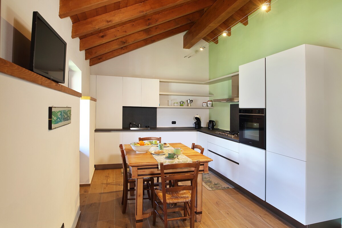 Apartamento articulado en un amplio espacio con comedor, sala de estar y cocina. Mesa grande que se puede utilizar como escritorio, cocina grande, zona de sofás con TV. Se puede disfrutar de una hermosa vista del espacio verde del jardín. Sobre un altillo con vigas a la vista: un espacio de relajación con un sofá cama de dos plazas que se convierte en una cama muy cómoda. Un pasillo conduce al dormitorio, con cama francesa y balcón con vistas al lago y una bonita mesa de centro. Al lado está el baño con ducha.