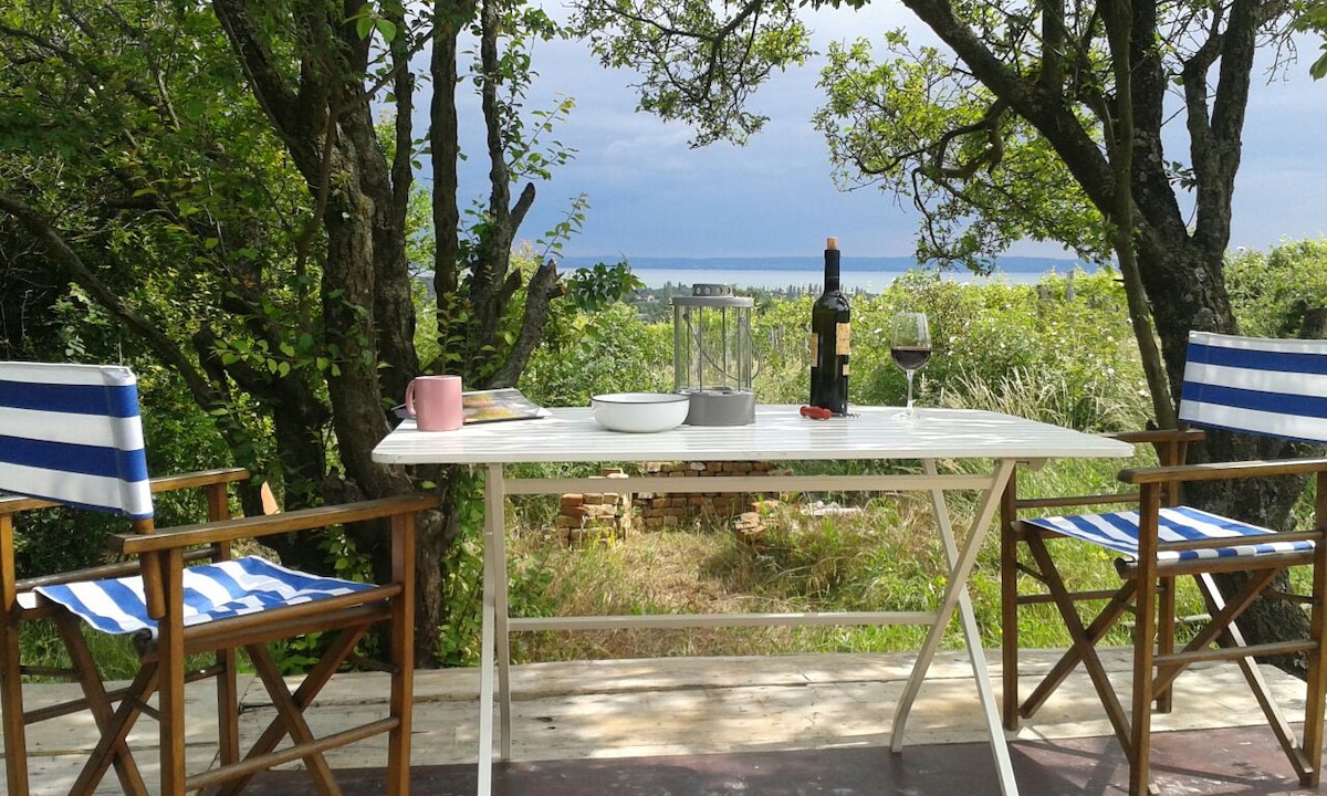 Afueras de♥ Balatonalmádi♥. Vista espectacular. ♥ 3000 m². Cabaña ♥ mágica. ♥ 4 + 1 persona. A ♥ 5 minutos en coche de la playa. ♥ ♥ Lejos de los ruidos, pero cerca de los lugares de interés. ♥ Escarabajos. Silencio. ♥ Bosque. Flores ♥ silvestres. ♥ Como en el paraíso. ♥ Este lugar fue el paraíso de nuestra pequeña familia durante 5 años. Ahora seguimos adelante, pero dejamos nuestro tesoro atrás, para ti. La vista del lago es tan impresionante que casi te dejas caer en él. Los pájaros virtuosos cantan en el silencio. Bienvenido al paraíso.