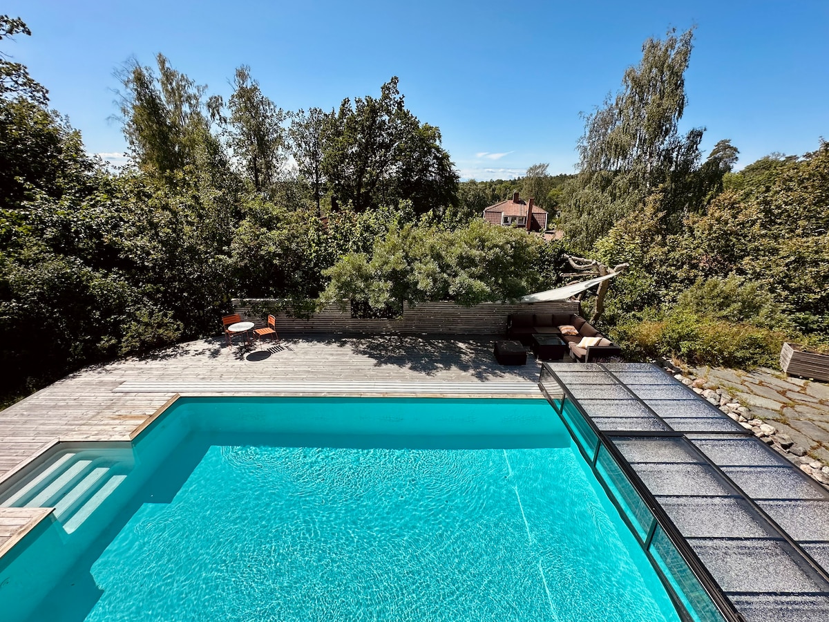 Villa con piscina grande, jacuzzi climatizado al aire libre para 6 personas, patio con sol todo el día, parrilla, sauna Muurikka, cocina/bar al aire libre, juego de sofás, gimnasio al aire libre, trampolín, casita de juegos Casa de huéspedes independiente, recién renovada, con 3 dormitorios y sofá cama en la planta superior Comedor y cocina de planta abierta Sistemas de sonido en todas las salas y en los espacios exteriores 2 baños con jacuzzi y sauna en el baño principal Tienda de comestibles cercana, parada de autobús frente a la casa. Estacionamiento para 3 vehículos, cargador para vehículos eléctricos de 11 kW por un costo adicional. A 2 km del centro de la ciudad y la playa. A 30 minutos en coche de Estocolmo.