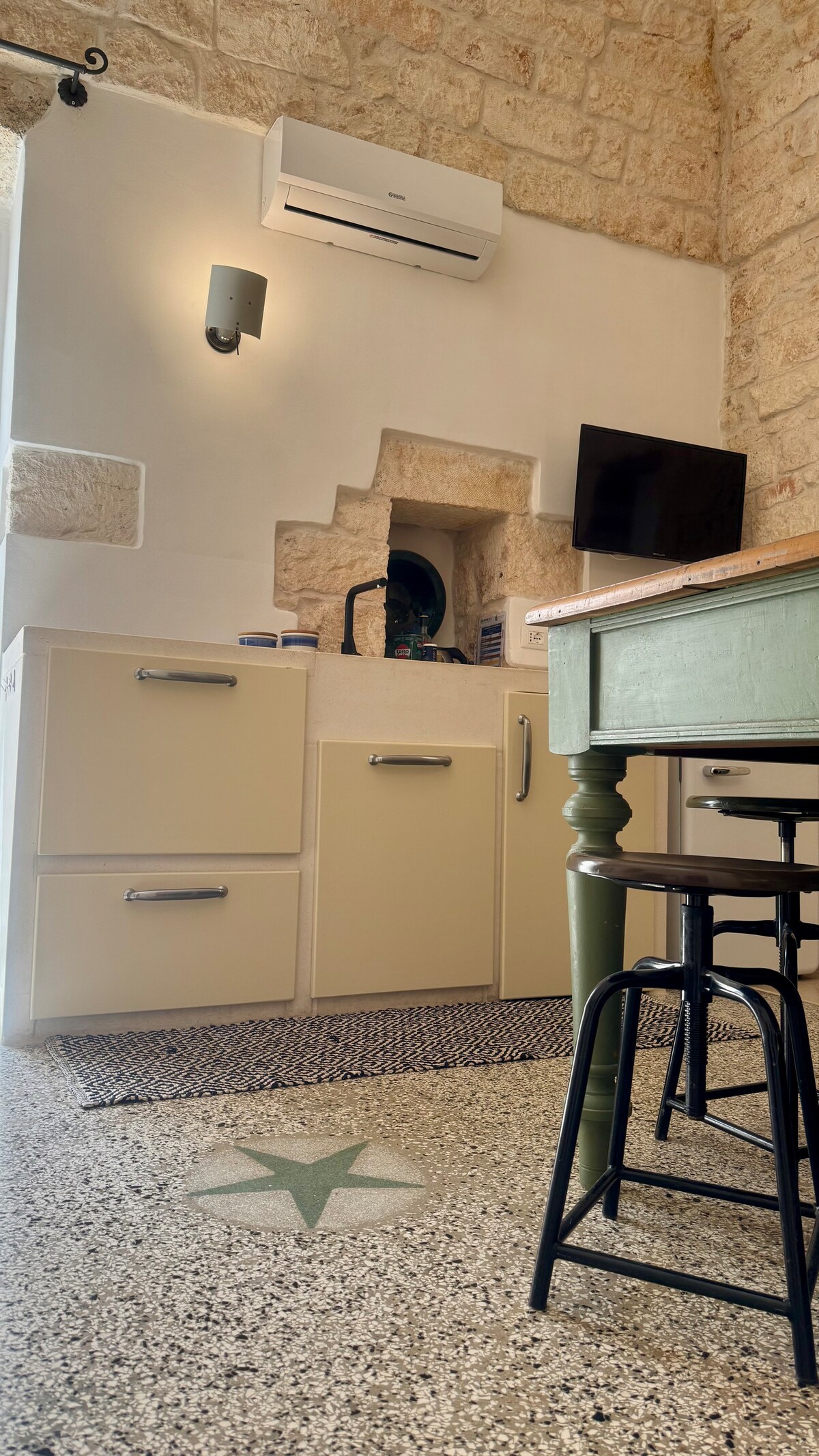La casa es un trullo del siglo XIX, completamente renovado, equipado con calefacción y aire acondicionado, televisor inteligente y conexión Wi-Fi. El dormitorio está equipado con una cama doble con mesitas de noche, lámparas de lectura y un armario. En la habitación, equipada con nevera, microondas, tostadora y cafetera espresso, hay un sofá cama; puedes cocinar y cenar en una mesa para 4 personas. Desde la habitación se puede acceder al baño equipado con lavadora, agua caliente, todos los accesorios del inodoro, lavabo, bidé y ducha con cabina.