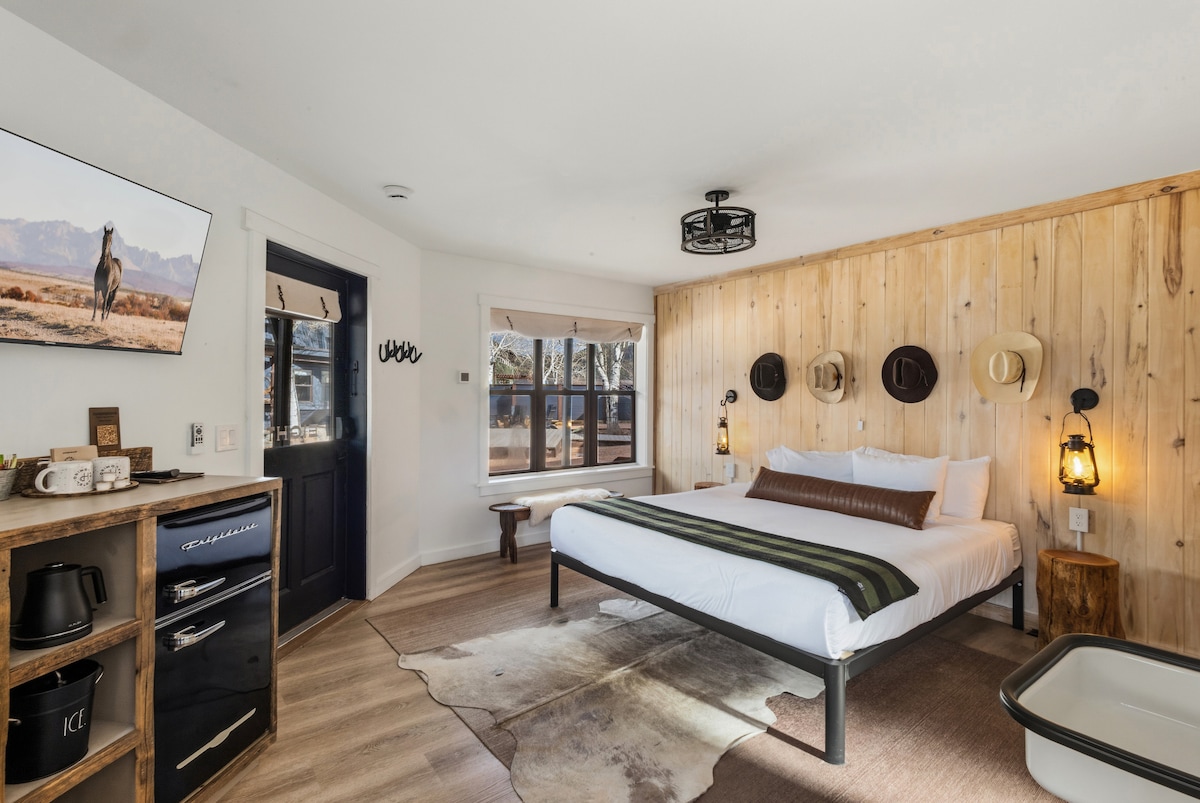 Quítate las botas en nuestra habitación tamaño king estándar de 260 pies cuadrados, decorada con una estética moderna y occidental única. Las paredes acentuadas en madera de álamo están adornadas con obras de arte occidentales, antigüedades y detalles cuidados de la rica historia ganadera de la región. La habitación incluye un pequeño escritorio para tu comodidad. (No tenemos recepción) Ocupación máxima 2, 2 mascotas de tamaño mediano y menos de 75 libras son bienvenidas en esta habitación con una tarifa de 30 USD por mascota y noche.