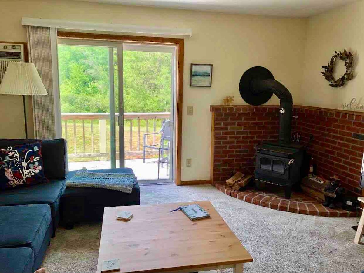 Luminoso y espacioso condominio frente al lago en el primer piso. Completamente amueblado con sábanas y toallas incluidas. La ropa de cama incluye muchas almohadas y cálidos edredones para la comodidad invernal. Sábanas de franela para invierno y algodón para el verano, suministros de papel, especias, aceites y condimentos básicos. He suministrado cafetera, olla de barro, licuadora, microondas, tostadora, cuencos grandes y platos de cazuela y platos de cazuela. Una estufa de leña proporciona calor en invierno, leña e iniciadores de incendios incluidos (calor de respaldo eléctrico).