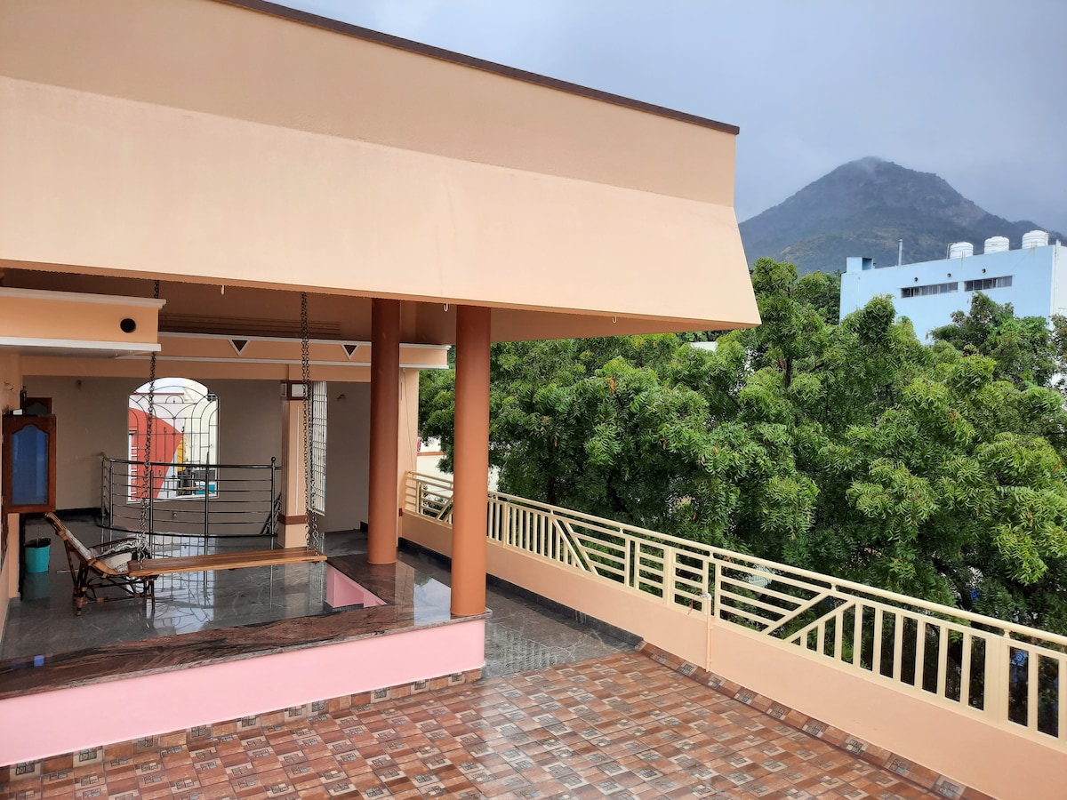 Find spiritual bliss in this 3rd-floor retreat, just 10 mins walk (600 Metres) from Sri Ramanasramam and Yogi Ramsuratkumar Ashram. Unobstructed, wide-glass views of Arunachala mountain offer a profound spiritual connection. Aesthetically designed with modern comforts and a bamboo sofa in corridor for meditation, a peaceful sanctuary in Tiruvannamalai. Only stairs to improve your health (No Lift)