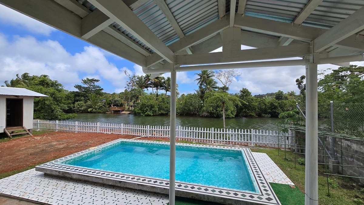 Olvídate de tus preocupaciones en esta espaciosa y serena villa, situada entre los árboles tropicales y a la orilla de un río que lleva tu kayak a un lago o al océano cercano. Relájate en nuestra terraza después de un rápido chapuzón en nuestra piscina de inmersión y contempla las estrellas después de las bebidas al atardecer y una barbacoa con la familia. Todo está aquí en Pacific Harbour, Fiji.