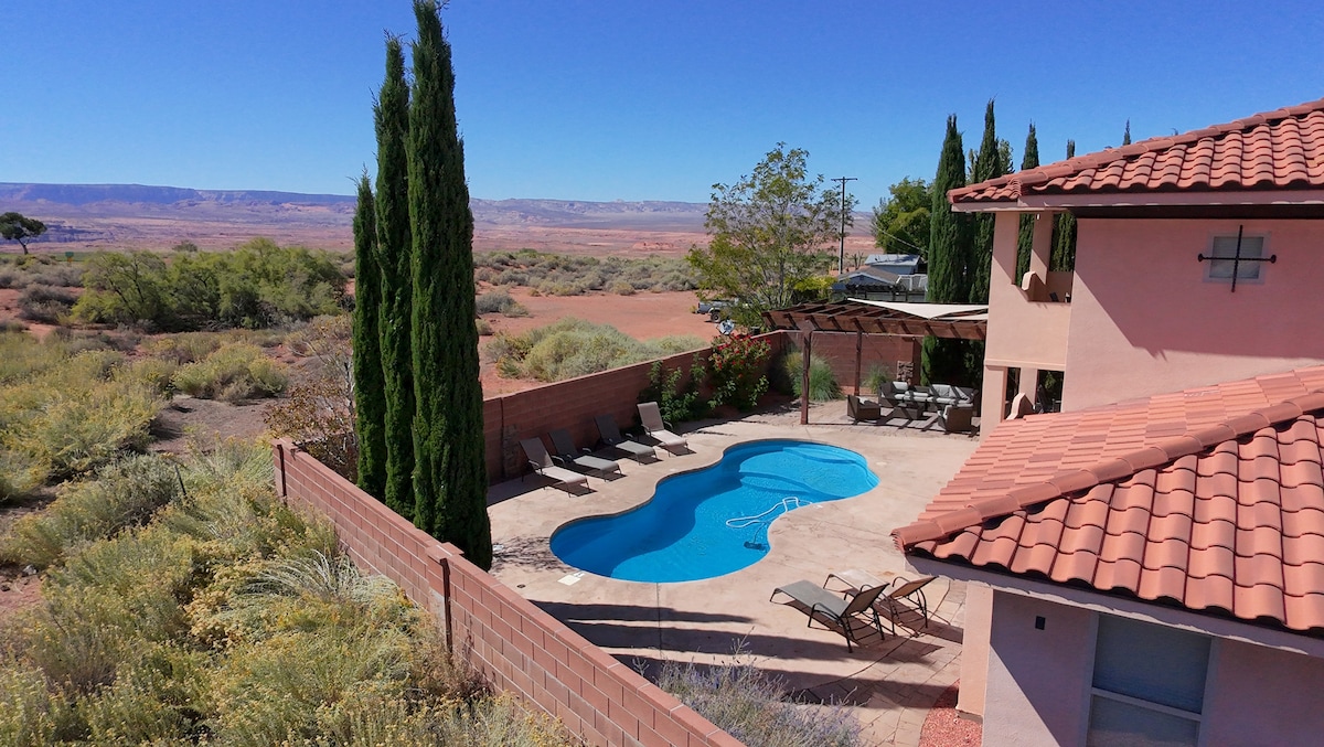 @ lpvacationhome Nestled on the rim of Page, Arizona this home has amazing views of the Vermillion Cliffs, Glen Canyon, and sits on the Lake Powell National Golf Course. Just minutes to Horseshoe Bend, Antelope Canyon Tours, Wahweap Marina and Antelope Marina. A great place to make some memories! Beautiful Tuscan two story with a new swimming pool. Large outdoor space for entertaining with 2 additional patios. 3 car garage, and room for toys.