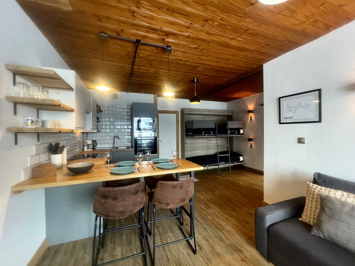 Estudio cabaña reformado de 17 m2, ideal para 2 personas, pero con capacidad para 4 personas Dispone de 4 camas, un sofá cama doble en el salón y 2 camas plegables en la entrada A 2 minutos a pie de los remontes (150 m) y cerca de todos los comercios, una parada de transporte gratuito está justo debajo de la residencia El apartamento dispone de lavavajillas, cafetera, tostadora y hervidor de agua, así como de armario para esquís Se incluyen sábanas, toallas y limpieza Wifi gratuito