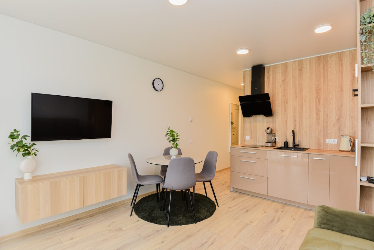 Apartamento hogareño en una casa construida en 2021 con terraza, a solo unos pasos de la playa. Un lugar relajante y tranquilo con terraza y aparcamiento privado, a solo 3 minutos a pie de la playa de arena de Kunigiškiai. Somos una gran opción para parejas y familias pequeñas que quieran explorar la costa lituana o un lugar perfecto para unas vacaciones relajantes junto a la playa. Solo hay dos apartamentos en el edificio.