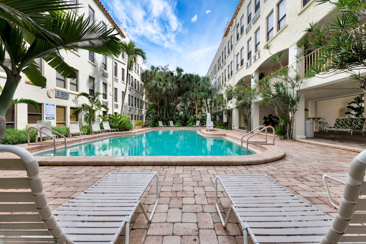Serene, sun‑drenched studio overlooking heated pool and lush tropical courtyard at a 1926 historic landmark hotel residence on Palm Beach Island. This thoughtfully appointed room has private max-speed wifi, new AC, 100% cotton linens/towels, full blackout drapes, luggage storage, and 24/7 front desk. Parking spot *included* for this unit but no car needed at this unbeatable location! Gated beach, shops, cafés, museums, historic landmarks, and nature trails all within three blocks.
