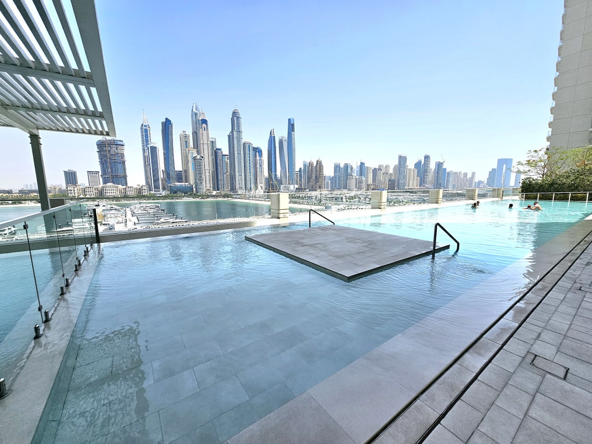 Designer brand new 1BR apartment with all modern appliances, furniture and stunning views of Dubai Eye and Palm Jumeirah Located right in the epicentre of luxury - Marina Vista is ready to indulge you with everything one can only dream of for an unforgettable stay Guests can enjoy state of art facilities - Gym, Infinity Pool, Kids Pool, direct access to two Private Beaches, Meeting Rooms, BBQ area and Kids Playground