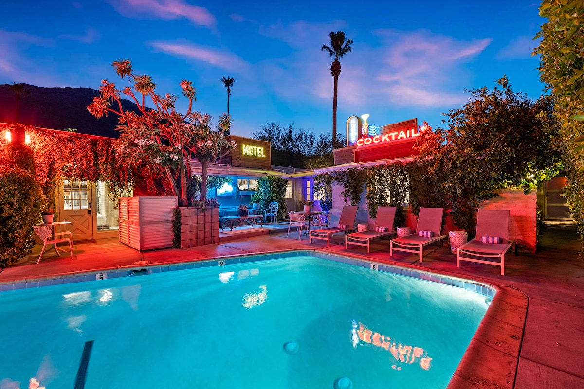Whether you're booking a solo stay or a weekend with your besties, the Barbie suite is your private desert escape. This dreamy, retro-pink desert oasis is perfect for girls’ trips, birthday celebrations, or bachelorette weekends. Features a king bed, full kitchen, and direct access to a heated pool and hot tub. Enjoy resort-style amenities in an intimate, adults-only setting. Your glamorous experience awaits in the desirable Warm Sands neighborhood, just minutes from downtown