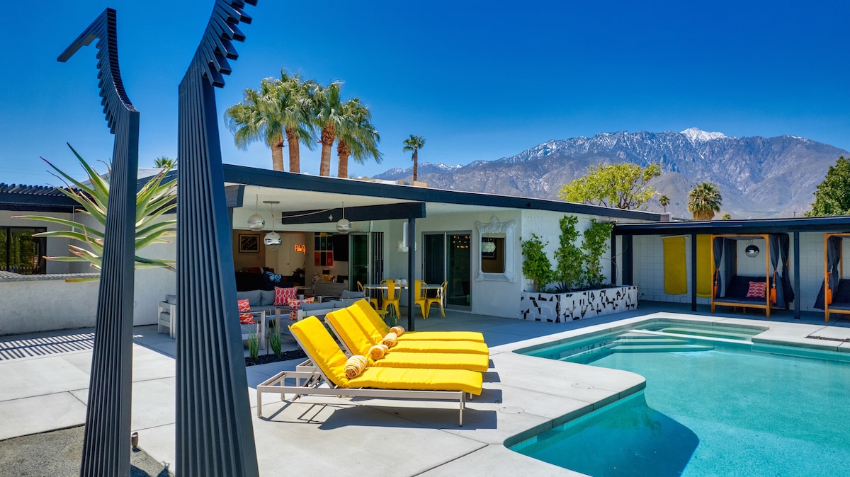 Bienvenido a El Sahara, ¡un lujoso oasis recién renovado en Palm Springs! La finca de media hectárea cuenta con un patio trasero tipo resort con piscina y spa de gran tamaño, espectaculares vistas a la montaña y atardeceres. Disfruta del salón de la cabaña, el comedor y el bar al aire libre, la barbacoa de gas y la chimenea. ¡Te espera un entretenimiento sin fin: mesa de ping pong, putting green de golf, petanca y corn hole! El Sahara tiene 4 dormitorios únicos y 4 baños. 3/3 en la casa principal y 1/1 en la casita separada.