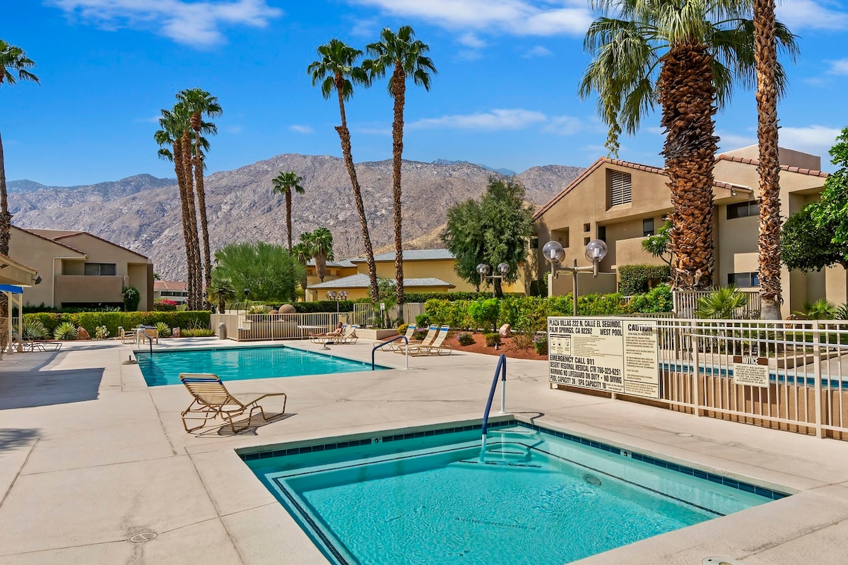 Magnífico Renovado 2 dormitorios, 2 baños con todos los muebles nuevos, suelo nuevo. Este apartamento está en el complejo Plaza Villas, enfrente del casino The Aqua Caliente en el centro de Palm Springs. Cuenta con impresionantes vistas a las montañas del suroeste con vistas a la piscina principal. Este encantador apartamento tiene una cocina completa, un gran comedor, una sala familiar con techos abovedados, 2 terrazas que muestran las vistas, donde puedes sentarte y tomar tu café de la mañana o cócteles por la noche.