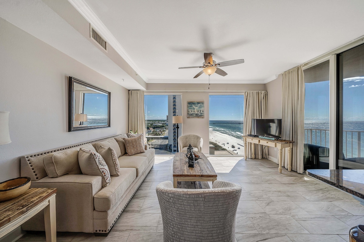 This 7th-floor corner unit condo at Tidewater Beach Resort offers breathtaking panoramic views of the endless shoreline of the emerald Gulf Coast. From the private balcony or the comfort of the living room sofa or dining table, enjoy stunning sunsets over the ocean and dazzling city lights at night. Resort boasts incredible amenities, including two lagoon-style pools, a heated indoor pool, hot tubs, a state-of-the-art fitness center with a Roman spa, a movie theater, and private beach access.