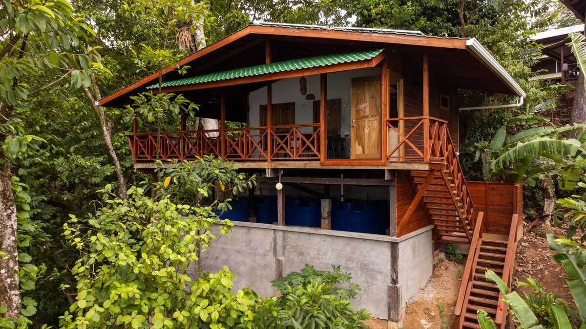 Despiértate con impresionantes vistas a la selva y al mar en este bungalow ecológico de lujo en la cima de una colina en Isla Bastimentos. Construida con madera local, cuenta con una sala de estar al aire libre con flujo de aire natural, ventanas con mosquitero, un dormitorio con aire acondicionado, wifi y una cocina completa. Disfruta de la serenidad, la sostenibilidad y el paisaje caribeño, al que se llega por 89 escalones panorámicos, perfectos para parejas de luna de miel, viajeros ecológicos y nómadas digitales que buscan un refugio privado en la isla.