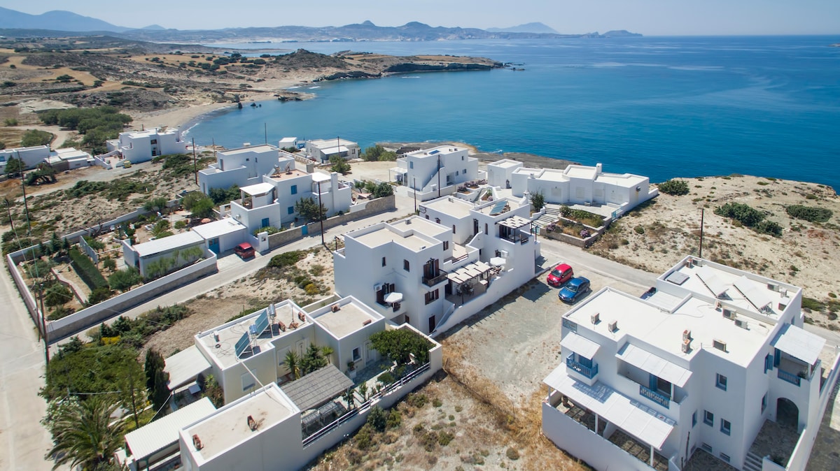 Apartamento privado de granja con techos altos, dormitorio y baño. Rincón de cocina especial, preparación de desayunos y platos fríos. 2 balcones (40 m2 en total), con vista panorámica al puerto de enfrente y al mar de Sarakiniko detrás (el paisaje lunar está a solo 15 minutos a pie). Distancias: a 4 minutos en coche del puerto y a 7 del aeropuerto. Plaka: 5 km, Pollonia: 7 km, Fyriplaka-Tsigrado en 15 minutos. Jardín recientemente ajardinado, entorno natural con privacidad y tranquilidad.