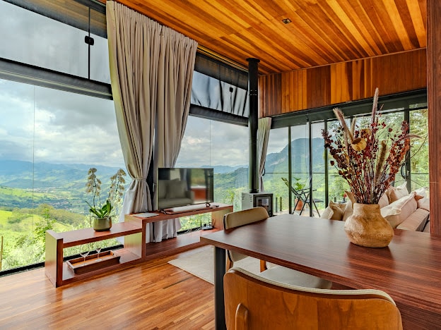 Descubra o encanto da Serra da Mantiqueira nesta cabana projetada para que você possa contemplar o nascer do sol sem sair da cama. Venha relaxar em nosso spa aquecido, observar as estrelas na rede suspensa e balanço. A cabana possui um quarto integrado com uma aconchegante cama Queen. Na sala/cozinha, um futon super confortável acomoda mais dois hóspedes, tornando a experiência ideal para famílias. A propriedade também conta com trilhas e pequenas quedas d'água.