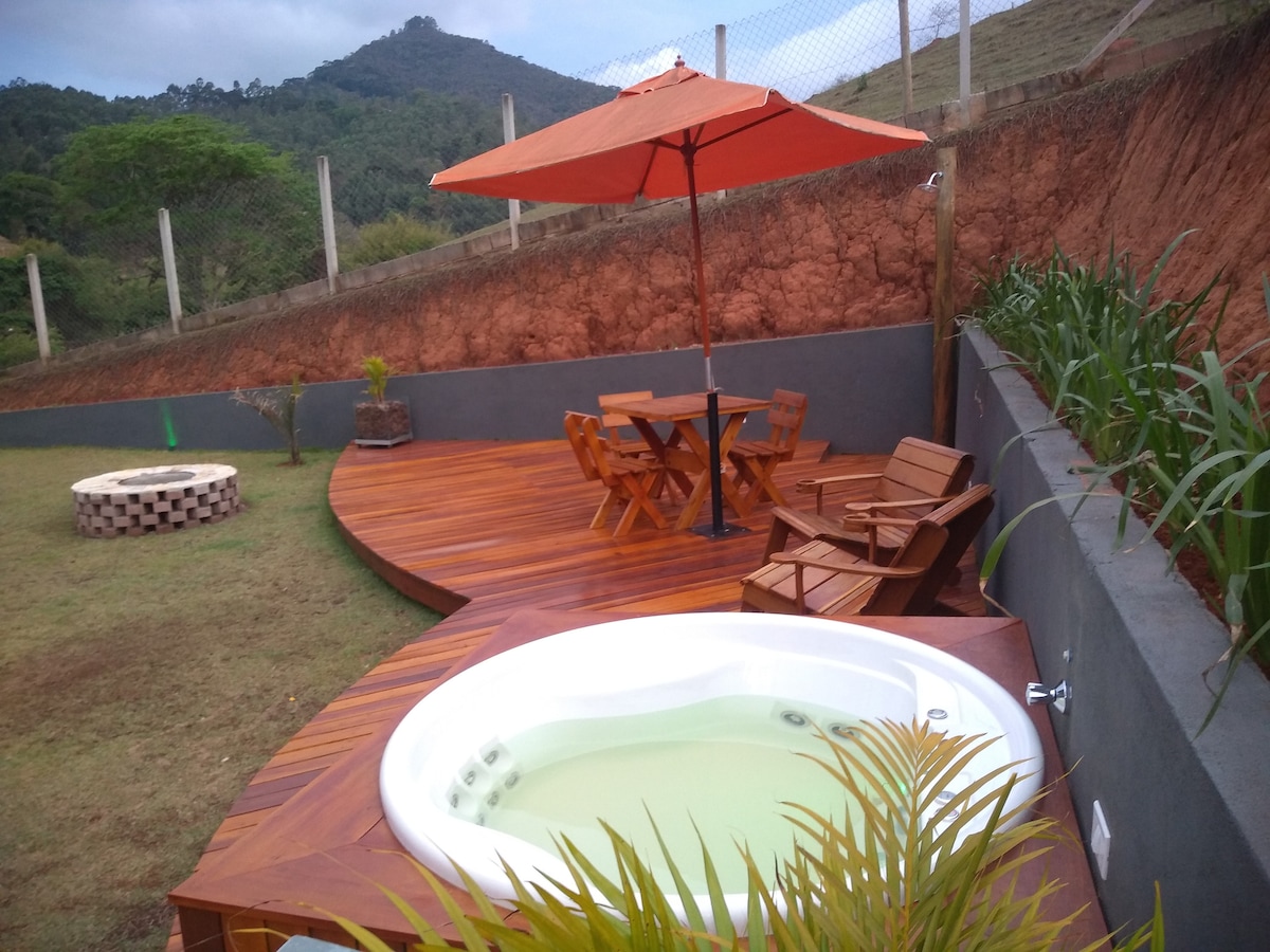 Lugar acogedor. Situado en la parte superior de una montaña con una vista inspiradora. Anexo de mi casa, totalmente independiente, incluyendo el agua y la piscina. Cuenta con 2 suites, una cocina gourmet americana, una sala de estar con SKY TV, Wi-Fi con Starlink (alta velocidad) y calefactores eléctricos en los dormitorios. En el exterior, hay una piscina infinita, bañera de hidromasaje, chimenea en el suelo y total privacidad. A 900 metros del centro de la ciudad y totalmente pavimentado. ¡Nos encantan los animales! Contacta con nosotros