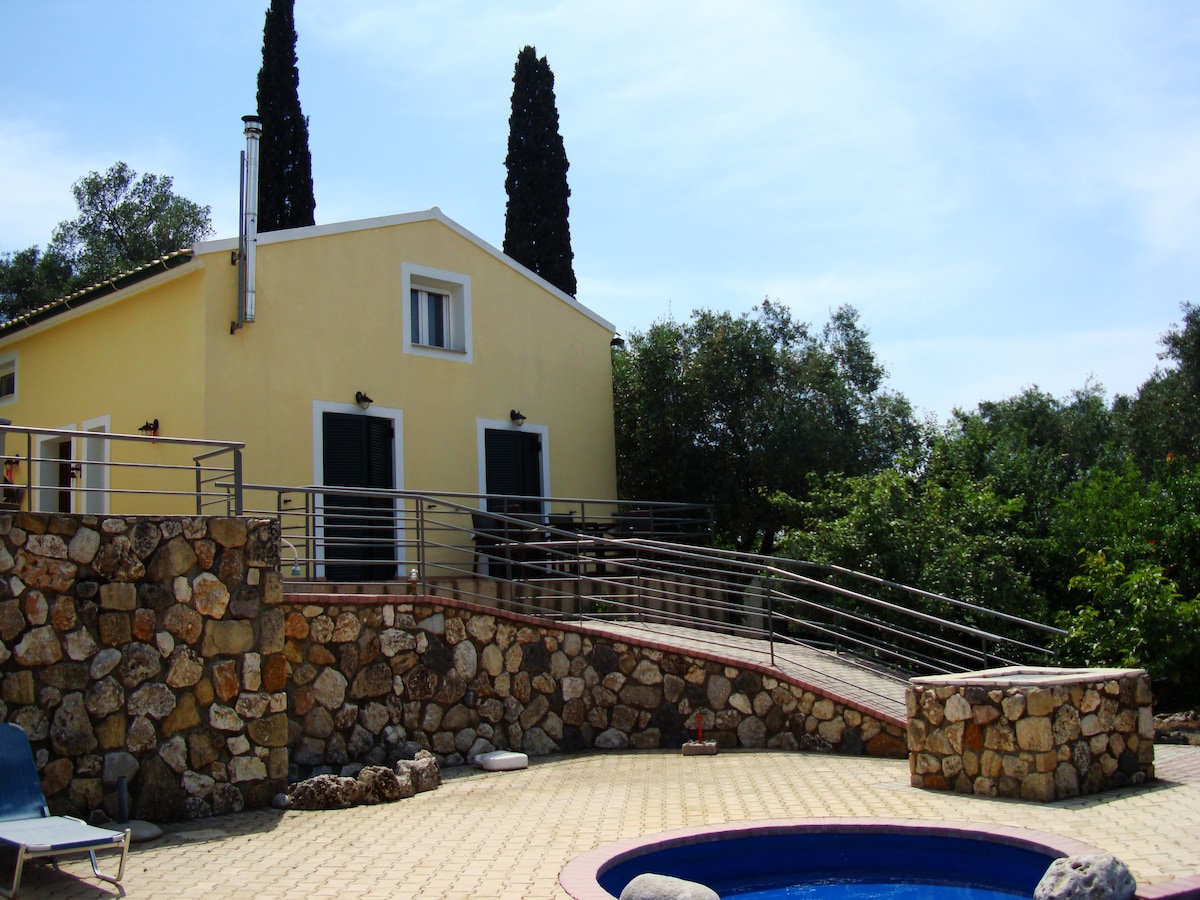 La casa está en el pueblo de Liapades, en el noroeste de Corfú, a unos 20 km de la ciudad de Corfú y a 400 m de una de las playas más famosas de Corfú, Rovinia. A unos 100 metros de la carretera principal y bajando la colina, proporciona privacidad en un hermoso entorno natural con impresionantes vistas, mientras que al mismo tiempo está a unos 500 metros de la zona turística del pueblo de Liapades y a 800 metros del centro del pueblo.