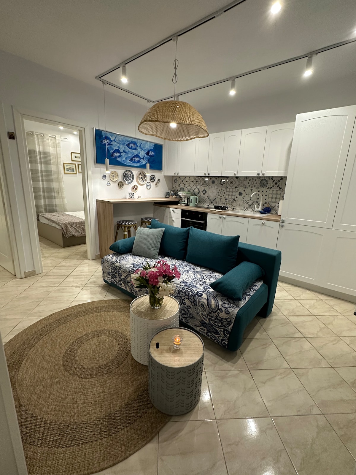 Portofino - Sea View Lux Apartment es un apartamento moderno completamente nuevo, a solo 100 metros de la orilla del mar. Cuenta con una cocina totalmente equipada, un dormitorio con cama de matrimonio, una sala de estar con un sofá que se puede convertir en cama de matrimonio y un baño. Además, cuenta con wifi y un televisor inteligente con el programa NETFLIX. El apartamento tiene un balcón delantero con vistas abiertas al mar, las palmeras exóticas y el jardín florido del edificio de apartamentos. También cuenta con estacionamiento gratuito.